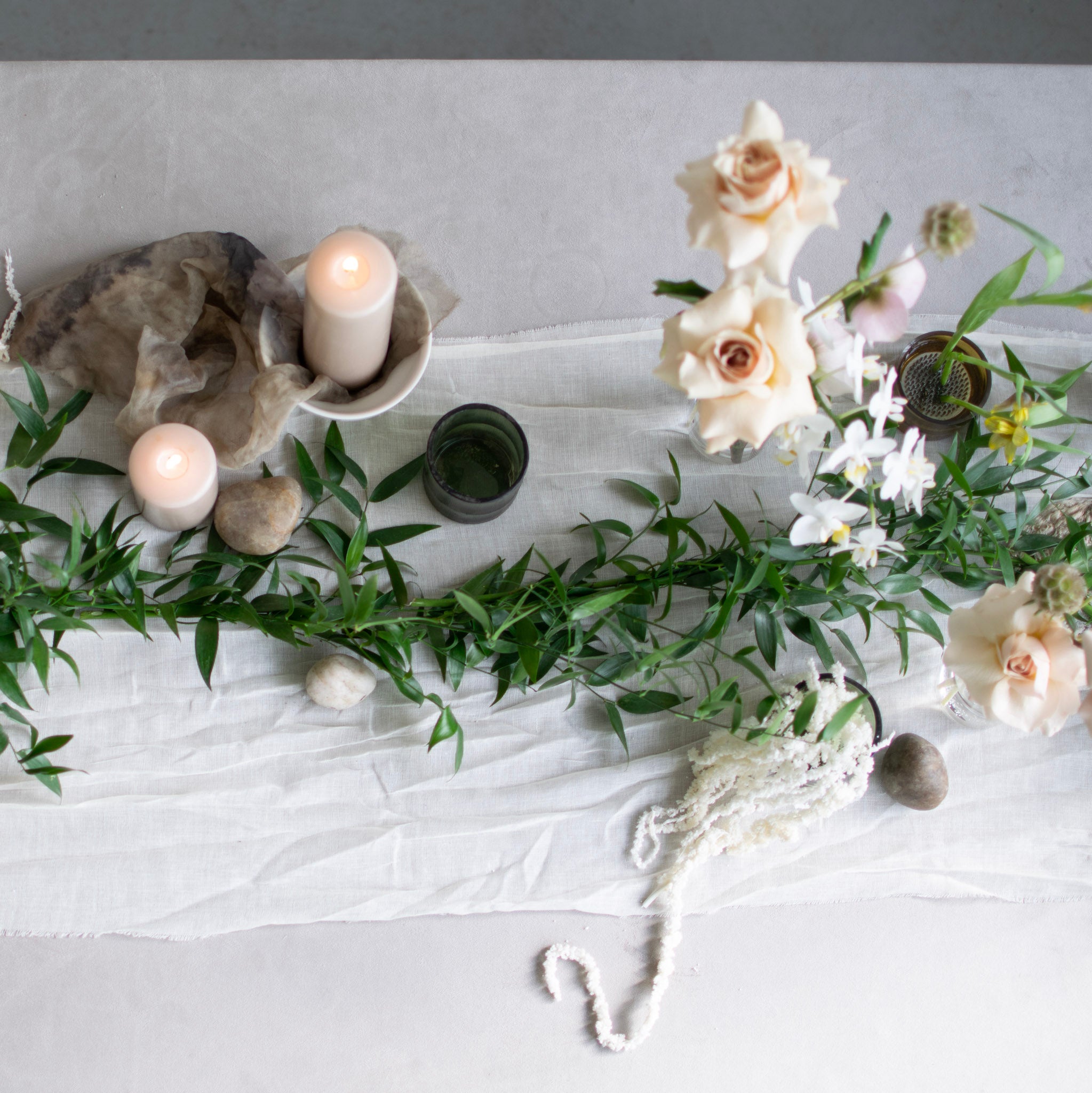 In the sample photos, our garland is laid on this white rectangular table that measures 31.5" in width and is accompanied by our Simple Bud Vase (glass).