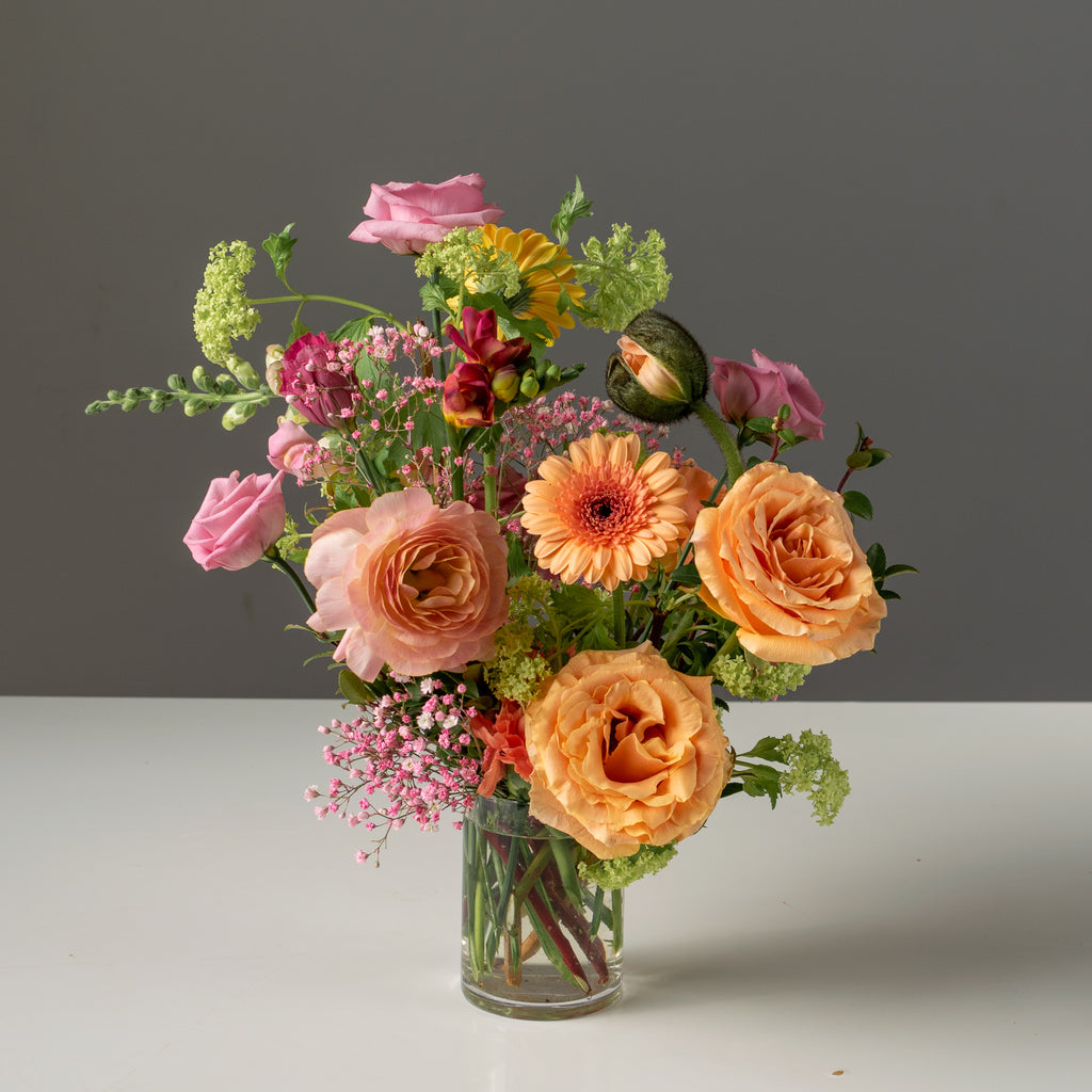 We get in fresh, seasonal flowers almost every day. This means you'll get the freshest blooms available, but your arrangement may look quite different than the sample pictures. No two arrangements are ever identical as the flowers change day by day.